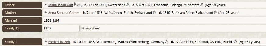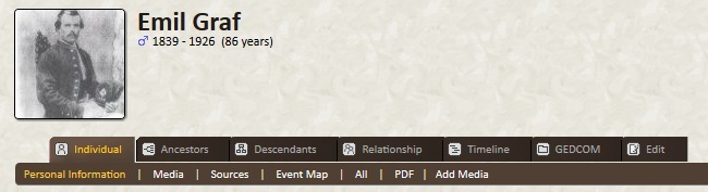 This will give you a list of the results that were found to match. On this list, click on the name of the Emil whose Person ID is "I242" (Born 2 March 1839, Stein am Rhine, Switzerland). You are now at his Individual Page, the header of which you see below.
