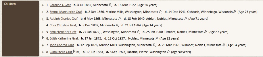 If you hover the mouse pointer over the child's name you get a pop-up window previewing their parents, spouse and any children; click on the name to go to that child's