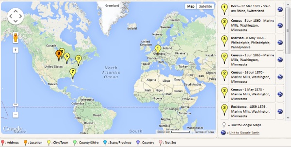 An Event Map may be visible; click on 'Event map' to display it if not. This shows the location of the main events in the life of the individual.