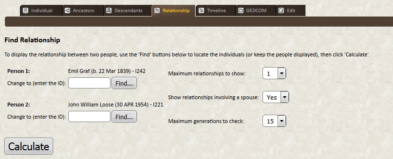 Just click on the "Find" button under "Person 2" and search for "John Loose" (remember, last name first). Select 'John William Loose' (ID-I221) and click "Calculate"