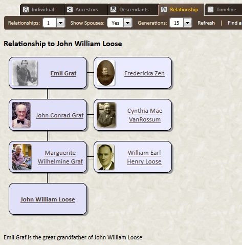 3) The " Relationships" tab allows you to generate a box chart to show the relationship between this individual and any other person in your tree.